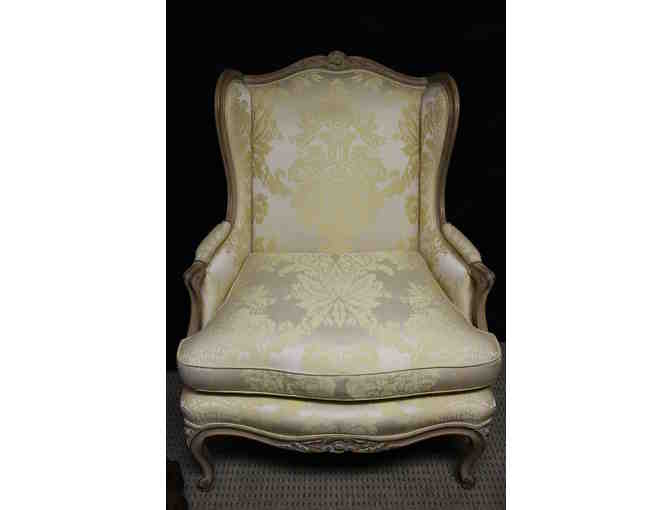 Nestle up with a good book and relax while sitting in this very elegant yet comfy Louis XV style brocade upholstered wing back armchair. This delightfully yellow brocade upholstered armchair is suppported on cabriole legs and scroll feet. You will want a library like Belle's when you claim this chair for yourself.