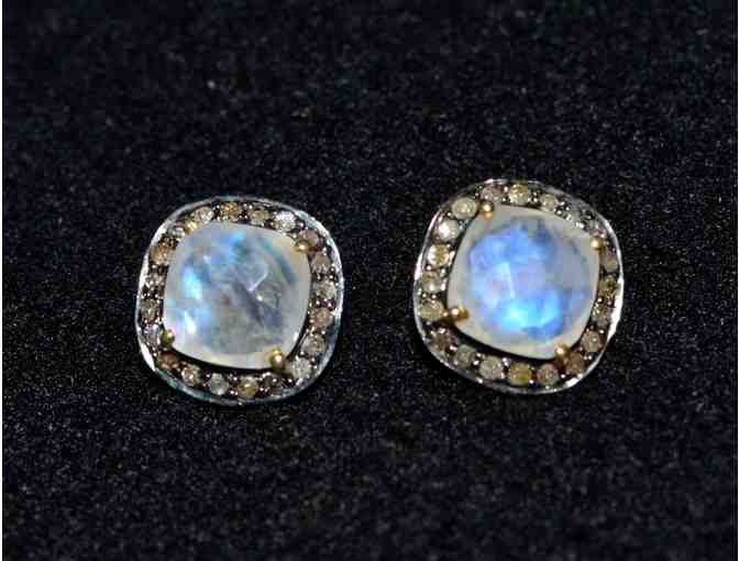 Diamond and moonstone earrings, measuring 1/2 inch in diameter.