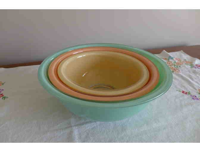 Set of three Pyrex mixing bowls measuring 10", 8.5", and 7" in diameter. Clear bottoms. Very good condition.