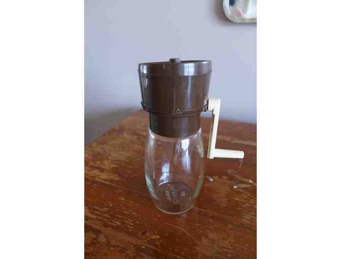 Vintage nut chopper. Glass bottom and plastic top. Very good condition.