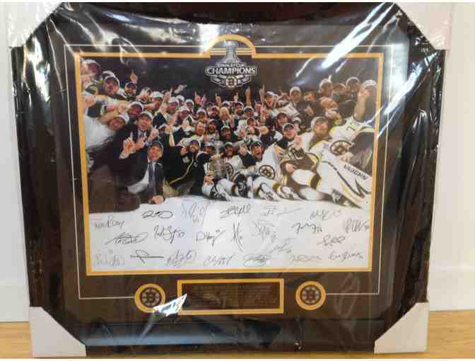 Replica signatures include Patrice Bergeron, Johnny Boychuk, Gregory Campbell, Zdeno Chara, Andrew Ference, Nathan Horton, Tomas Kaberle, Chris Kelly, David Krejci, Milan Lucic, Brad Marchand, Adam McQuaid, Daniel Paille, Rich Peverley, Tuukka Rask, March Recchi, Michael Ryder, Tyler Seguin, Dennis Seidenberg, Tim Thomas and Shawn Thornton.