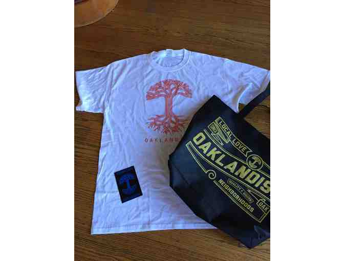Love Oakland! Get your sporty Oaklandish classic T shirt in a men's size large with a reusable shopping bag and Oaklandish sticker. Support UMCS and show your civic pride!