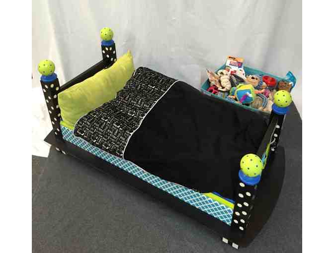 Get that tail wagging on your favorite 4-legged friend with this incredible dog bed! This custom, hand-painted creation has bright, fun accent colors and your pooch will surely snuggle up nice and cozy with the fluffy pillows. In addition, quite an assortment of toys and supplies has been placed into a nice and sturdy canvas bin for your precious pet to enjoy. Life is definitely good when you're lounging like royalty!