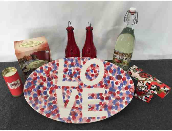 The highlight here is truly this adorable LOVE platter! Every student contributed finger prints in various colors to fill in around the letter outlines and highlight the word LOVE. So cute! Also included are a variety of items to show yourself a little love too. Indulge, relax, and enjoy some lemongrass bubble bath, vanilla tea lights and red lanterns, Tuberose eau de parfum, hand cream, and soap, plus a tea brewing system.