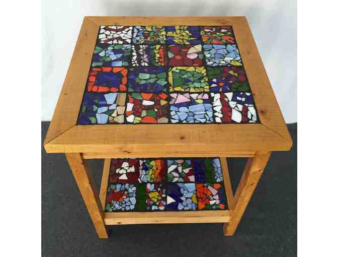 This awesome table has bright, colorful, and creative mosaic squares created by students in the class! One-half of the squares create the top of the table and the other half create a bottom shelf for the table. This unique one of a kind table is sure to make a fantastic addition to your home!