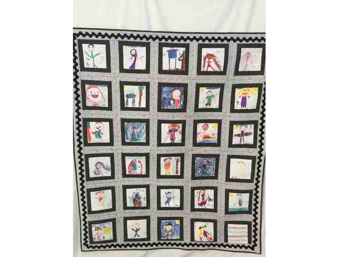 Have you ever seen a collection of self portraits as cute as these?!? This adorable quilt features self portraits drawn by students in the class with complimenting black and white polka dot patterns. It also has the days of the week on the back and measures approximately 100" x 58".