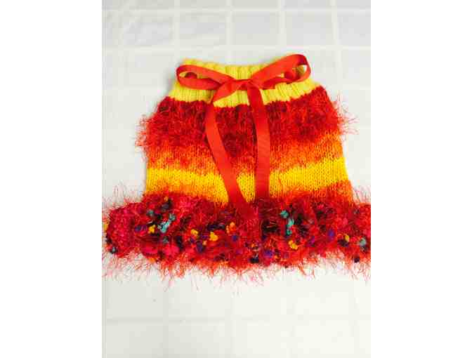 Handknit especially for the Armchair Auction, this skirt features a ribbon belt and flirty ruffle at the hem. Wide stripes of a variety of textured red, yellow and orange yarns make this a show stopper any little girl would love. The waist is adjustable and will fit many sizes!