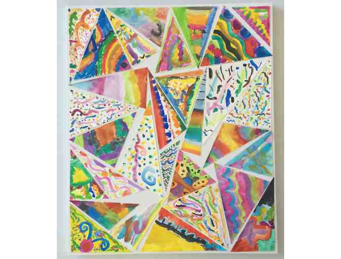 Students created this beautiful painted mosaic collage with watercolors. Painted papers are mounted on a canvas panel for easy display.