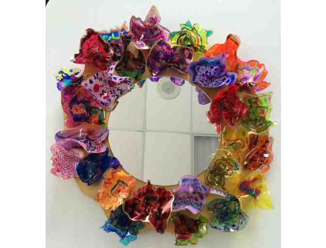 This mirror is a beautiful unique piece of art for your home. Students learned about glass artist, Dale Chihuly and each created a small rendition of his glass blown sculptures. Students colored and melted small pieces of a special plastic instead of working with molten glass, but the finished products are still extraordinary! All pieces have been mounted to a custom made frame and mirror and are ready to hang.