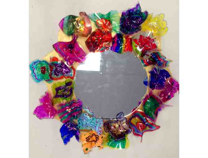 This mirror is a beautiful unique piece of art for your home. Students learned about glass artist, Dale Chihuly and each created a small rendition of his glass blown sculptures. Students colored and melted small pieces of a special plastic instead of working with molten glass, but the finished products are still extraordinary! All pieces have been mounted to a custom made frame and mirror and are ready to hang.