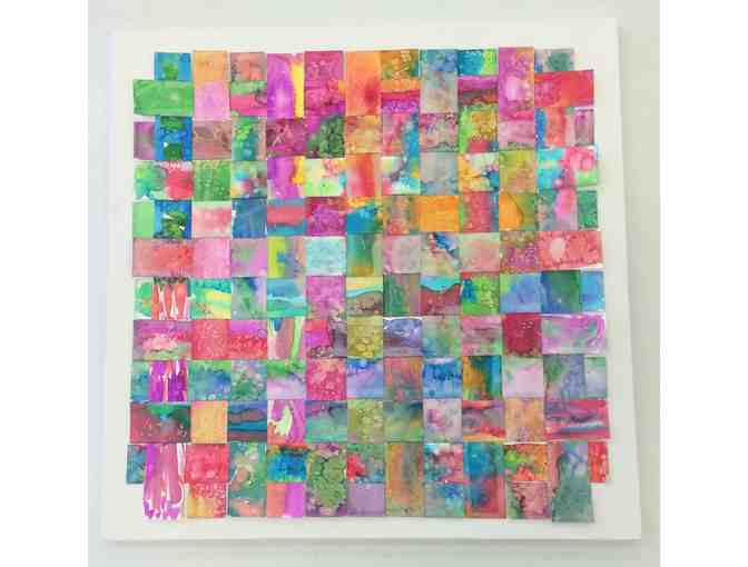 This beautiful weaving is a collaborative effort from the third grade class. Each student got to experiment with color by using liquid watercolor in various applications. All strips were woven together and mounted to a canvas panel so it is ready for display in your home.
