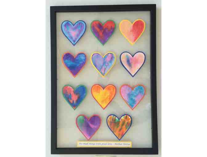 Students each crafted a beautiful paper heart and all the hearts are mounted in this lovely black float frame. Along with the hearts is the quote from Mother Teresa, “Do Small Things with Great Love”. Names of each preschool artist are featured on the back of the frame.