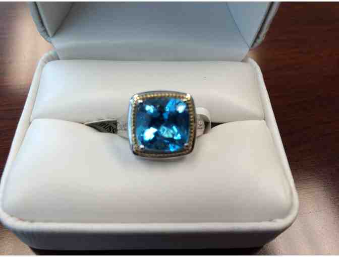 A glistening blue topaz ring from Lord & Taylor. Set in sterling silver with 14 Kt. yellow gold around the stone, this ring is accented by diamonds at the shoulder.
