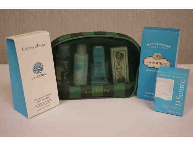 Keep skin nourished and hands soft with Crabtree & Evelyn La Source ultra-moisturizing hand therapy (3.5 oz.), hand recovery (3.5 oz.), moisturizing soap (3.5 oz.), travel kit including relaxing body wash (1.7 oz.), relaxing body lotion (1.7 oz.), ultra-moisturizing hand lotion (0.9 oz.) and nail buffer all packaged in a delightful toiletry bag.