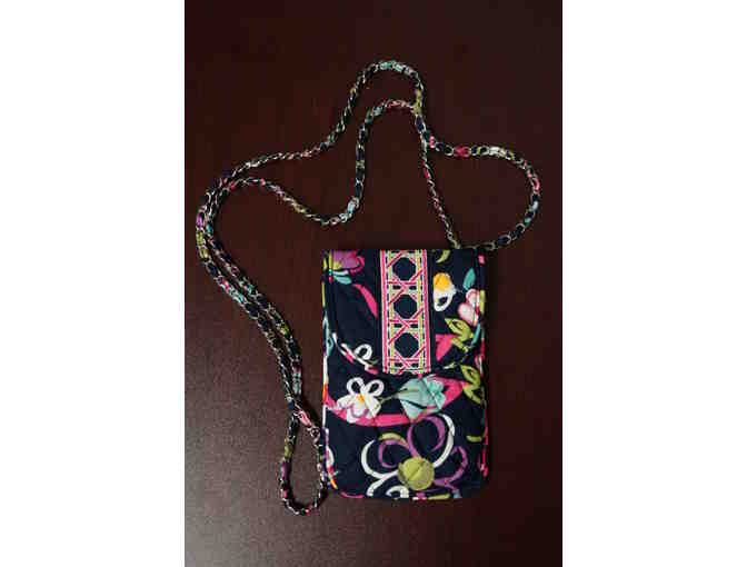 Now you’re talking! This cute little Vera Bradley crossbody is the perfect (and prettiest) way to carry your cell phone. A perfect fit for larger phones, like the iPhone 5 and Samsung Galaxy, this small wonder also works great for MP3 players, cameras and more. A handy back slip pocket with two credit card slots is great for cards and cash. Inside, the logo lining offers scratch protection and a fun pop of color.
