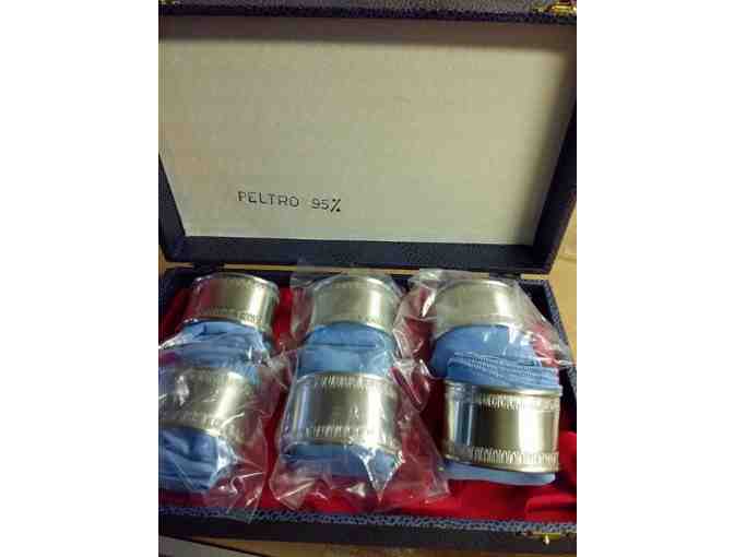 Set of 6 linen napkins with pewter napkin rings. Box is marked Peltro 95%.