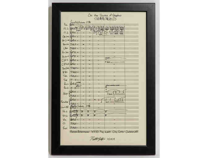 19x13 inch framed first page of piece commissioned by the West Virginia Symphony Orchestra and the Tannenbaum-Sternberger Young Artists Orchestra, signed by WVYS alum and composer Matt Jackfert.