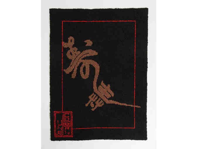 Method: The kimono was cut into strips, folded into fourths lengthwise to make pieces that were then applied to a rug canvas using a needlepoint technique.