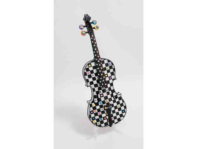 Checkerboard Painted Violin by artist Judy Belcher. Colored strings and polymer clay details.