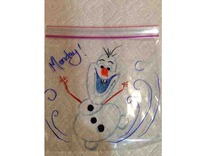 Winner can choose topic/designs for their child's sandwich baggies. Artist has created baggies w/ Harry Potter designs, Frozen theme, Monster High theme, Pokemon theme, Dragon theme, and Cartoons!