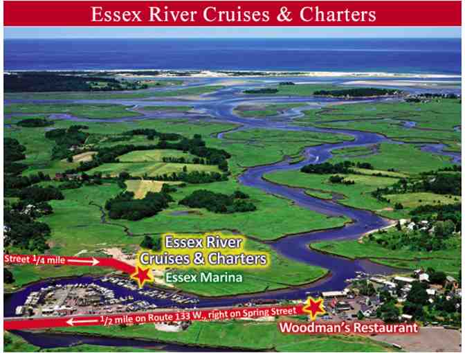 Passage for (2) abourd the Essex River Queen (week Day only) Cruise with Essex River Cruises and Charters to explore the unspoiled natural beauty of the Essex River and learn about landmarks along the way. Essex River Cruises operates within a tidal estuary. Our tour explores the salt marsh and navigates within a protected bay.