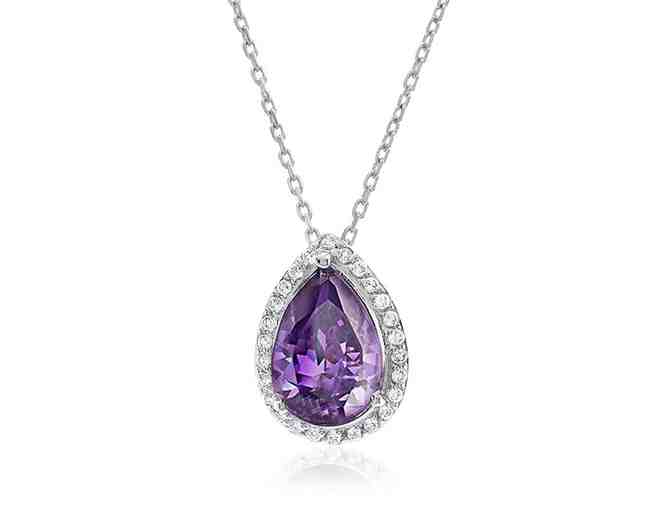 Plush purple gemstone hues are a wonderful accessory to your look. Finely-crafted of Sterling Silver is a pendant with a pear-cut genuine amethyst surrounded by white topaz accents for a 3.50 Carat total weight. Hangs from an 18 inch oval link chain.