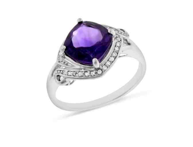 Show off a shimmering Amethyst ring for a bold look of color. The cushion cut Amethyst glows atop this sterling silver ring. Framed by created white sapphires, this luminous look works from day to night.