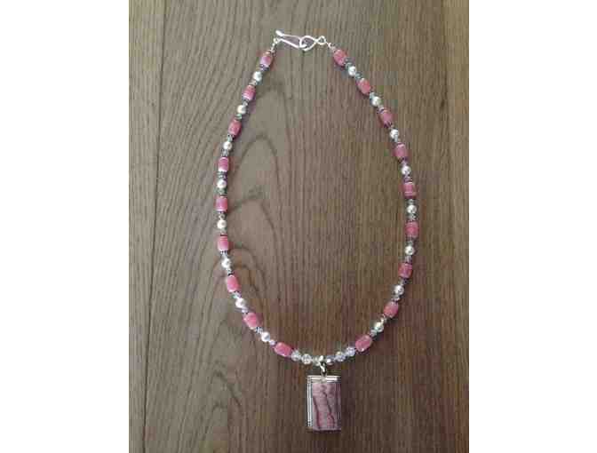This Mexican crazy lace agate, also known as "the laughter stone," has bands of pink, white, and grey. It is set in a silver rectangular pendant and further embellished with pearls and swarovski crystals.