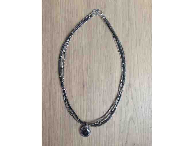 A black onyx pendant adorns four delicate strands of black and silver beads.