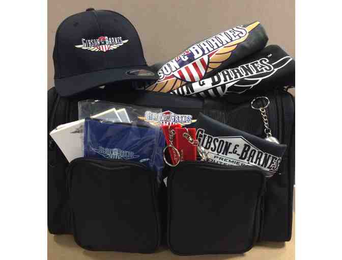 Gibson & Barnes head set gear bag filled with t-shirts, ball cap, helmet visor cloth, pens, key chains, koozies, and more!