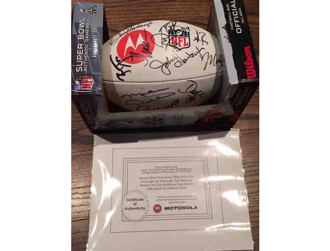 Authentic Superbowl XLVI football autographed on Feb 3, 2013 by Marcus Allen, Drew Brees, Mike Ditka, John Harbaugh, Jim Harbaugh, Paul Hornung, Ronnie Lott, Clay Matthews, Sean Payton, Mike Smith, and DeMarcus Ware.