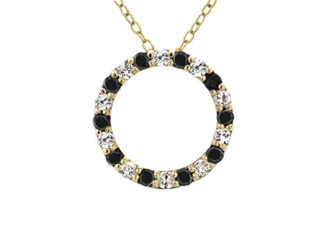 The striking contrast of clear and black cubic zirconia stones, fashioned all around the ring pendant of this necklace, makes for a standout accessory. Fashioned onto an 18k gold plated-sterling silver chain, the crystallized ring dangles freely at center.