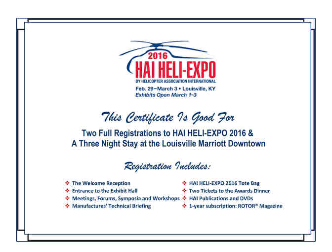 Two full registations to HAI HELI-EXPO 2016 and a three night stay at the Louisville Marriott Downtown. Registration includes the Welcome Reception, entrance to the Exhibit Hall, Manufactures Technical Briefing as well as meetings, forums, symposia and worskshops.