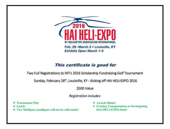 Two full registations to HFI's 2016 Scholarship Fundraising Golf Tournament. Registration includes tournament play, lunch, two mulligans Awards Dinner and evening transportation to participating HAI HELI-EXPO Hotel.