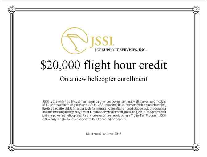 JSSI is offering $20,000 flight hour credit on a new helicopter enrollment. JSSI is the only hourly cost maintenance provider covering virtually all makes and models of business aircraft, engines and APUs. JSSI provides its customers with comprehensive, flexible and affordable financial tools for managing the often unpredictable costs of operating and maintaining nearly all types of turbine-powered aircraft, including jets, turbo-props and turbine-powered helicopters. As the creator of the revolutionary Tip-to-Tail Program, JSSI is the only single source provider of this trademarked service
