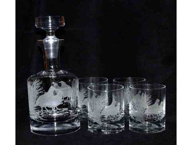 The Evergreen Crystal set includes a crystal decanter and four (4) double old fashioned glasses. Each piece was hand-etched and signed by artist, Lorrie Coyle. The etched design is a Bobwhite Quail scene.