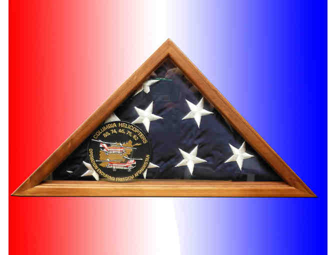 This flag was flown in a Columbia Helicopters' aircraft, in Afghanistan in support of Operation Enduring Freedom. The flag is mounted in a wooden frame, with a company fabric patch and challenge coin. A signed certificate with a photo of the flag in the helicopter is included.