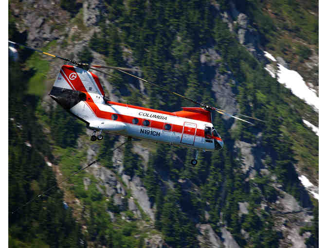 This is a framed color 16 x 20 photo of a Columbia Helicopters' Vertol 107-II helicopter, flying in the Cascade Mountains of Washington State. The image is signed by the photographer, Dan Sweet