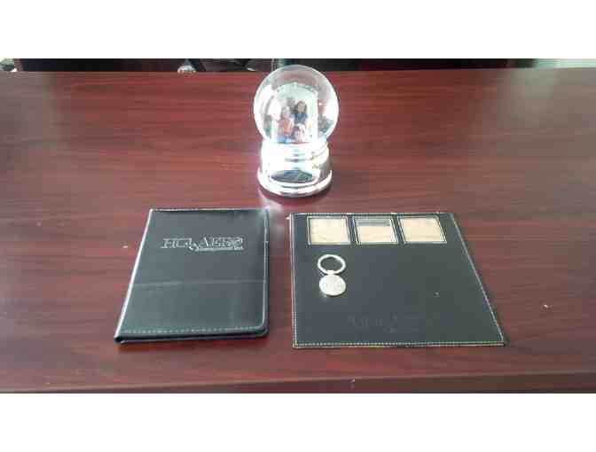 Leather Desk Set includes Alicia Klein leather mouse pad with picture inserts, Leeds leather portfolio note pad, and World Globe key chain, along with the Danbury Falls desk top water globe. Add your photo to this engraved musical snowglobe for extra meaning? Plays "Greensleeves". This musical snow globe is a fun alternative to a traditional picture frame. Insert a photo and engrave it with a special message and it becomes a one-of-a-kind gift they'll never forget! Turn it over and back and their smiles will shine through the glints and sparkles raining down through the globe. Package also includes a Port Authority ligh rain jacket (size L or XL)
