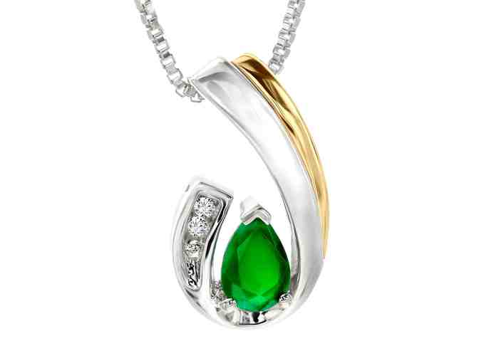 Silver and gold will put a stylish twist on any look. A bright 3/8 ct pear-cut emerald measuring 6x4 mm and brilliant diamond accents are set in an eye-catching setting of 14K gold and sterling silver in this chic, streamlined pendant. Piece measures 5/8 by 1/4 inches. Comes with a sterling silver 18-inch box chain.