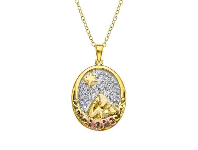 Carry your guardian angel with you wherever you go with this charming pendant! Guardian angel pendant features a backdrop of shimmering white Swarovski contrasting against a warm setting of 14K gold over sterling silver with an inspirational message on the reverse. Piece measures 1 1/8 by 11/16 inches.