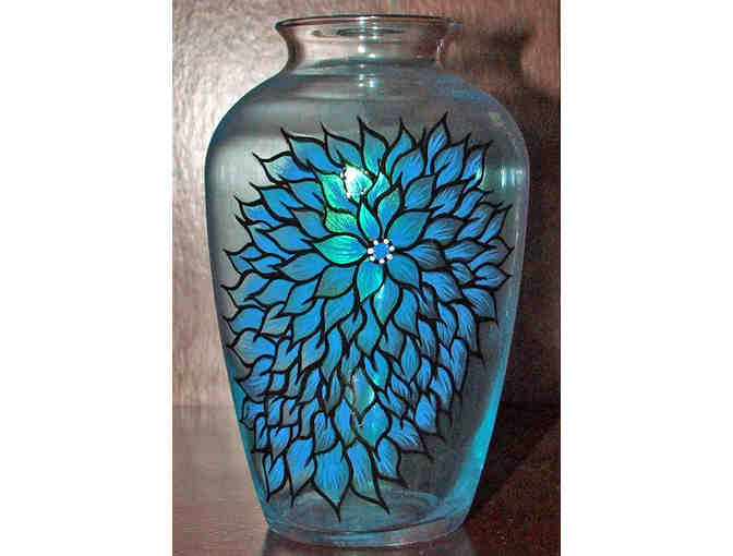 Hand painted glass vase with blue petals. 5 1/2" tall.
