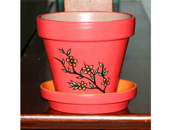 Clay pot hand painted red with orange flowers and orange and red saucer. The pot is 4 1/2" tall.