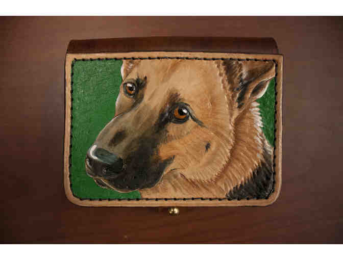 Small leather pouch (approx 5" square, 2" deep) features a hand-tooled, dyed and painted portrait of a dog's face on its flap. Pouch has a clip to allow it to hang from waistband or belt. Pouches are fitted with brass button-stud closures. Inside features a small D-ring hook to attach keys or other loose items. Pouch is handy to carry treats, waste bags or other dog walking necessities. The tooled design is tactile.