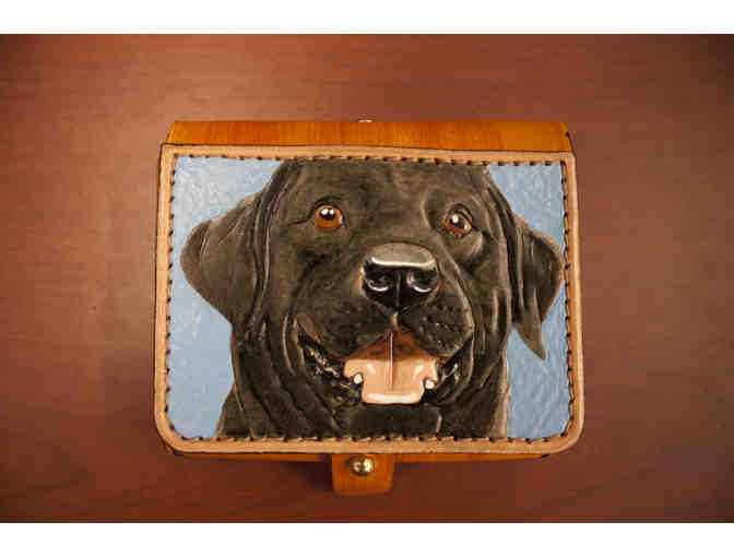 Small leather pouch (approx 5" square, 2" deep) features a hand-tooled, dyed and painted portrait of a dog's face on its flap. Pouch has a clip to allow it to hang from waistband or belt. Pouches are fitted with brass button-stud closures. Inside features a small D-ring hook to attach keys or other loose items. Pouch is handy to carry treats, waste bags or other dog walking necessities. Tooled design is tactile.