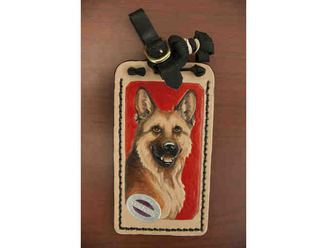 A sable colored German shepherd sits against a bright red background. He's looking directly out from the tag with his mouth open in a doggy grin. His ears are alert, as if he's waiting for his owner to call him for a trip to the park or perhaps the pet store for some treats. The tag can be used as either a badge holder or luggage tag. The tag is equipped with both lanyard (for badge holder use) and small straps with buckles (for baggage tag use).