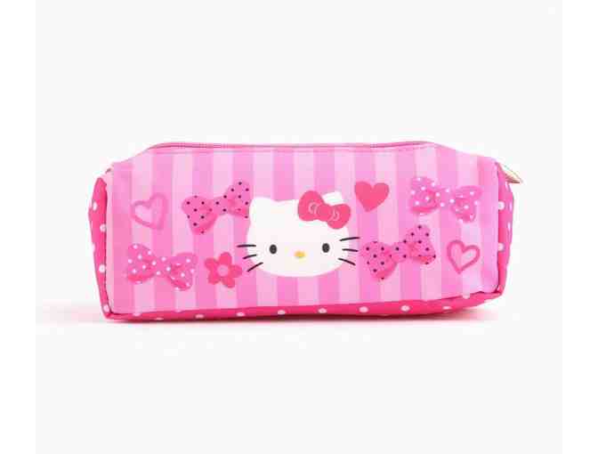 One side has Hello Kitty surrounded by many pink bows; the other side is a pocket with a pink bow overlapping a separate compartment.