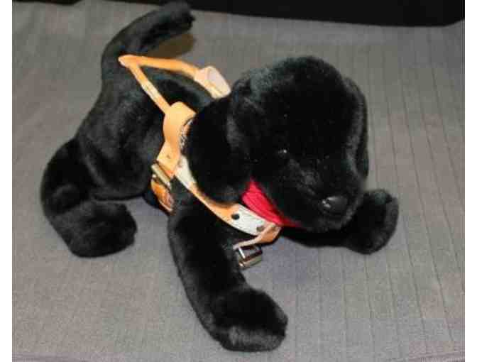Be one of a select few people to own a Seeing Eye Black Labrador Retriever 13-inch plush with a handmade harness! This soft-furred black Lab plush has dark eyes and a velvety black nose. Its ears are perked up at attention and it is awaiting its owner's instructions. A red bandana with The Seeing Eye's logo printed in gold metallic ink adorns the dog's neck.