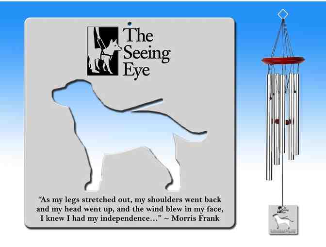 Enjoy that spirit of independence each time even a zephyr blows magical sounds through these silvery wind chimes. Tuned to the five notes of the pentatonic scale, above middle c (g, b-flat, c, d, f) these 23 inch-long chimes sound an endless variety of delicate, ethereal melodies. The striker has a cut-out shape of a Labrador retriever and the quote above from Morris Frank written in print below the dog cut-out. This chime is a harmonious way to mark your entryway, deck, garden, or a rural mailbox at the end of a driveway.