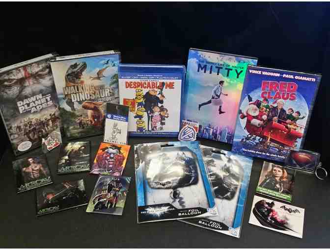 Warner Brothers, Universal and Fox goody bag complete with five family movies, two Dark Knight foil balloons, two WB collectible pins, nine WB magnets and one WB keychain.
